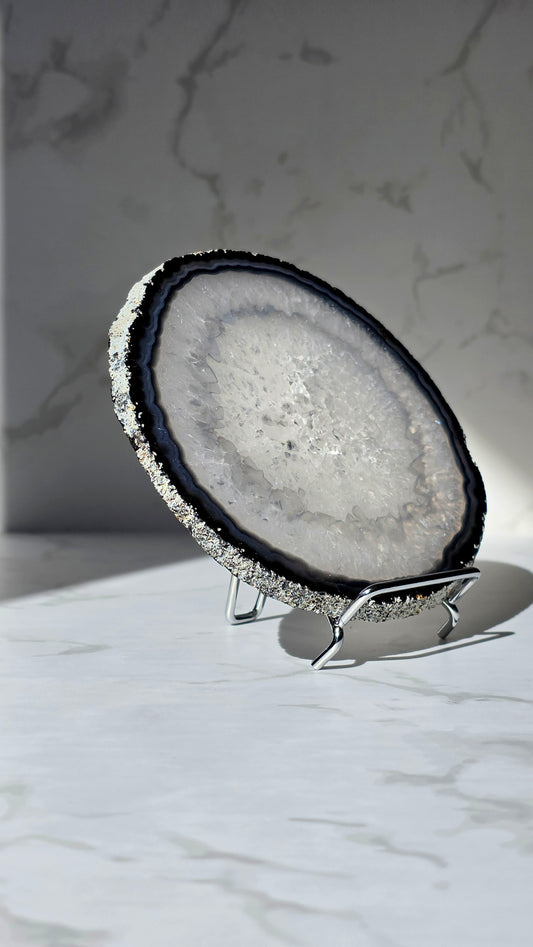 Blaue Achat Scheibe mit Glitzerdruse - wie der Mond