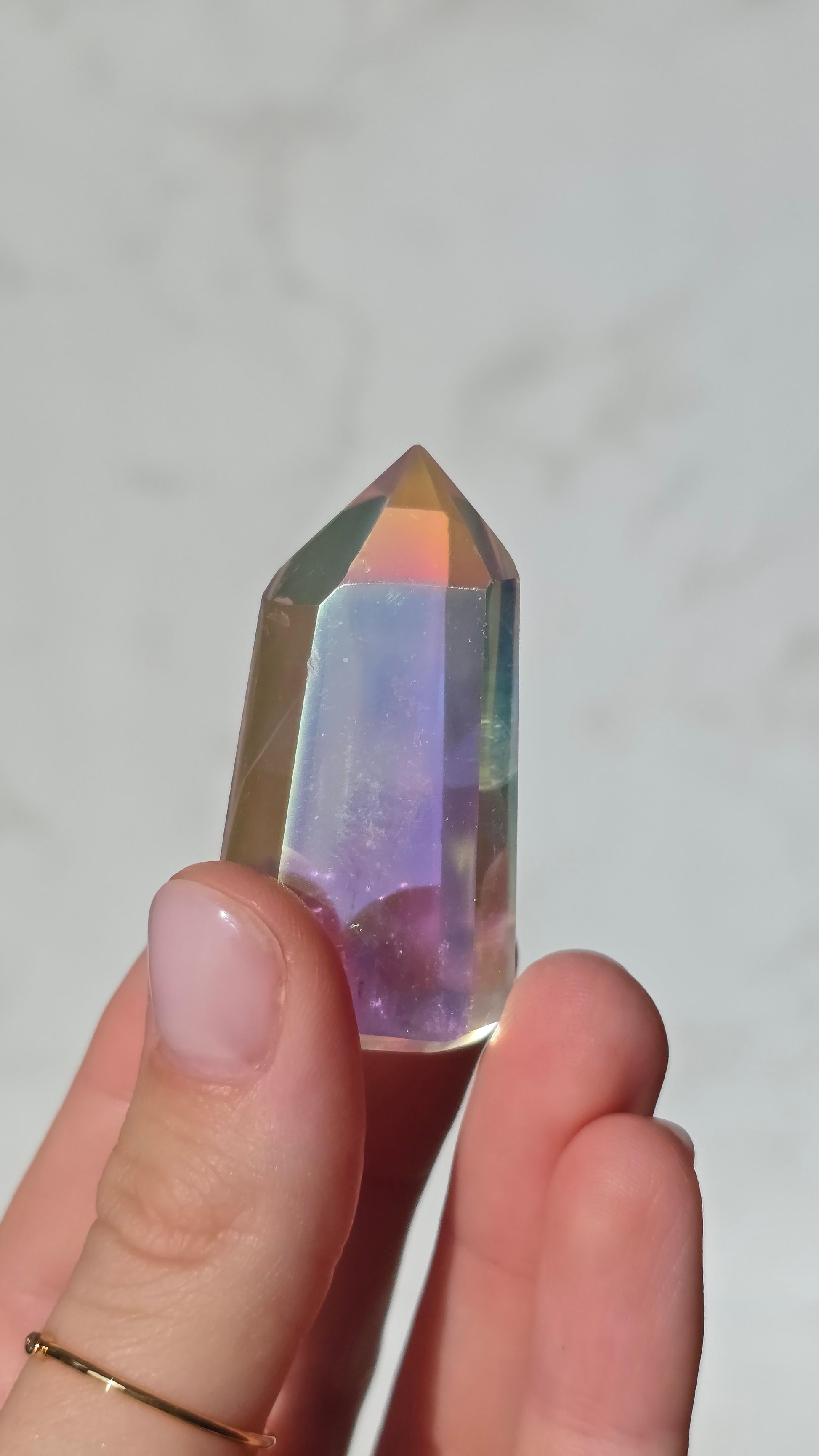 Angel Aura bezeichnet eine spezielle Veredelung von natürlichen Kristallen. Während viele Aura-Kristalle auf dem Markt leider nur lackiert sind und schnell an Qualität verlieren, setzen wir auf höchste Standards. Unsere Angel Aura Kristalle werden in Deutschland veredelt! Dabei wird durch eine spezielle Bedampfungstechnik eine hauchdünne Schicht aus Silizium auf den natürlichen Bergkristall aufgetragen.