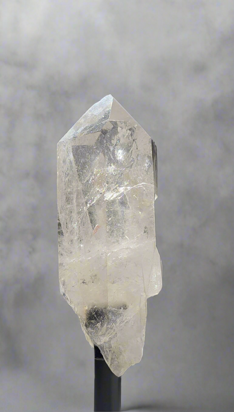 Die hier gezeigte Spitze wurde hochwertig geschliffen und poliert. Sie vereint Klarheit und natürliche Inklusionen auf faszinierende Weise. Die kleinen inneren Risse, die die Regenbögen entstehen lassen, machen jede Spitze zu einem Unikat – als hätte sich Licht selbst darin eingenistet.