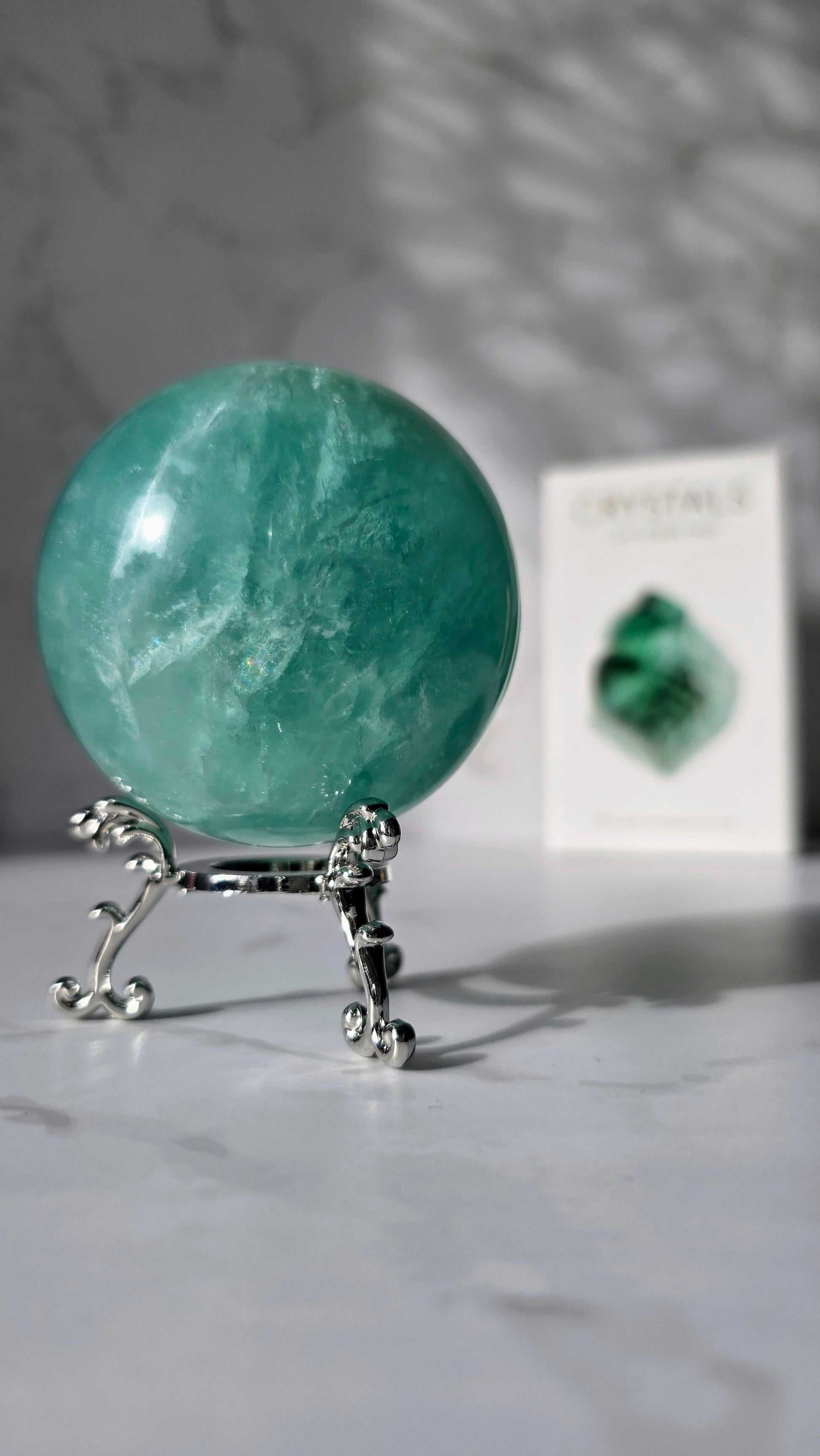 Diese grüne Fluorit Kugel ist ein echtes Juwel für Kristallliebhaber:innen und Sammler:innen – ihr sattes, kräftiges Grün in A-Qualität zieht sofort in den Bann. Im Inneren entfaltet sich ein spektakuläres Spiel aus Strukturen, das an ferne Galaxien oder kosmische Nebel erinnert – wie ein Blick in das Universum, eingefangen in einem einzigen, perfekt geschliffenen Stein.