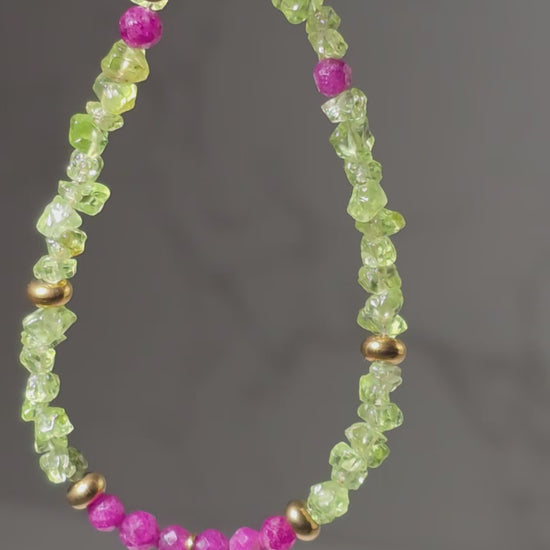 Dieses elegante Armband vereint leuchtend grüne Peridot-Splitter mit hochwertigen 4 mm facettierten Rubinperlen – ein außergewöhnlicher Mix aus Herzenergie und kraftvoller Lebensfreude.