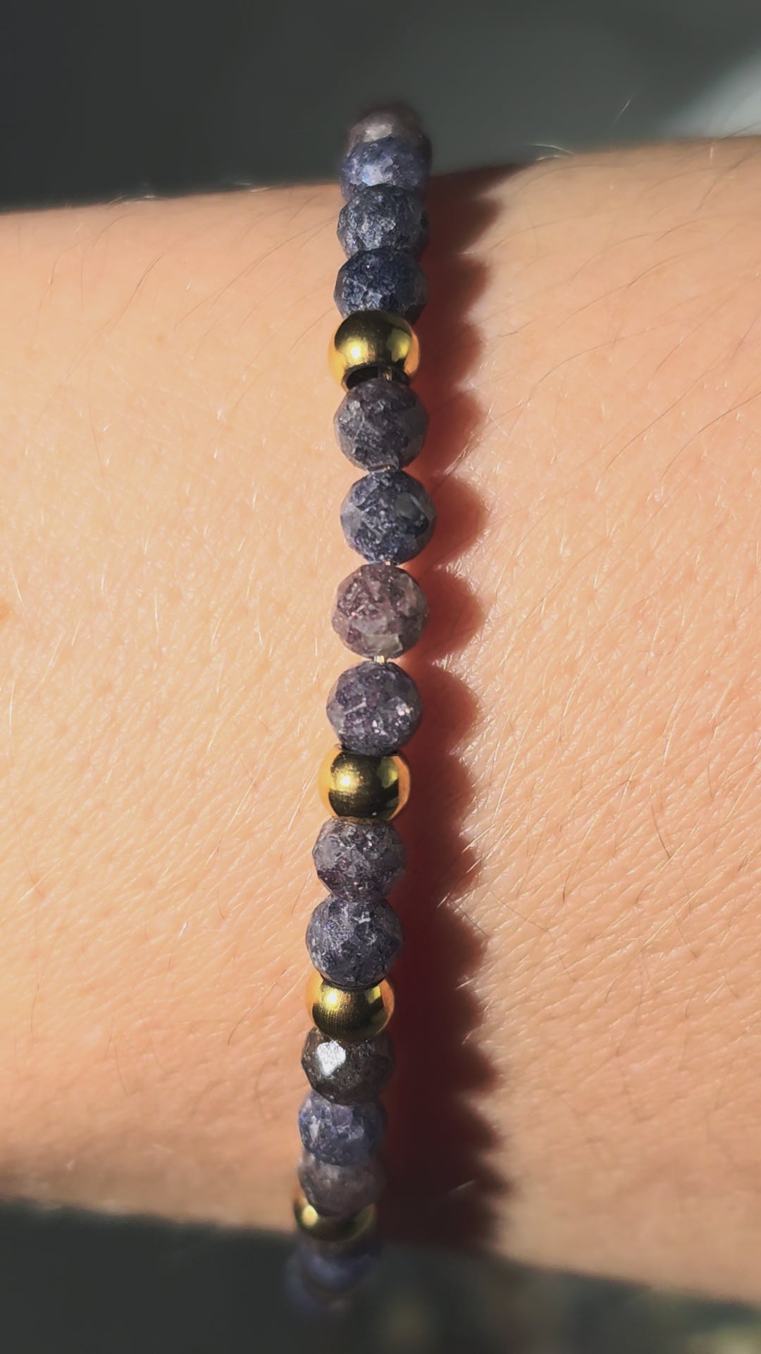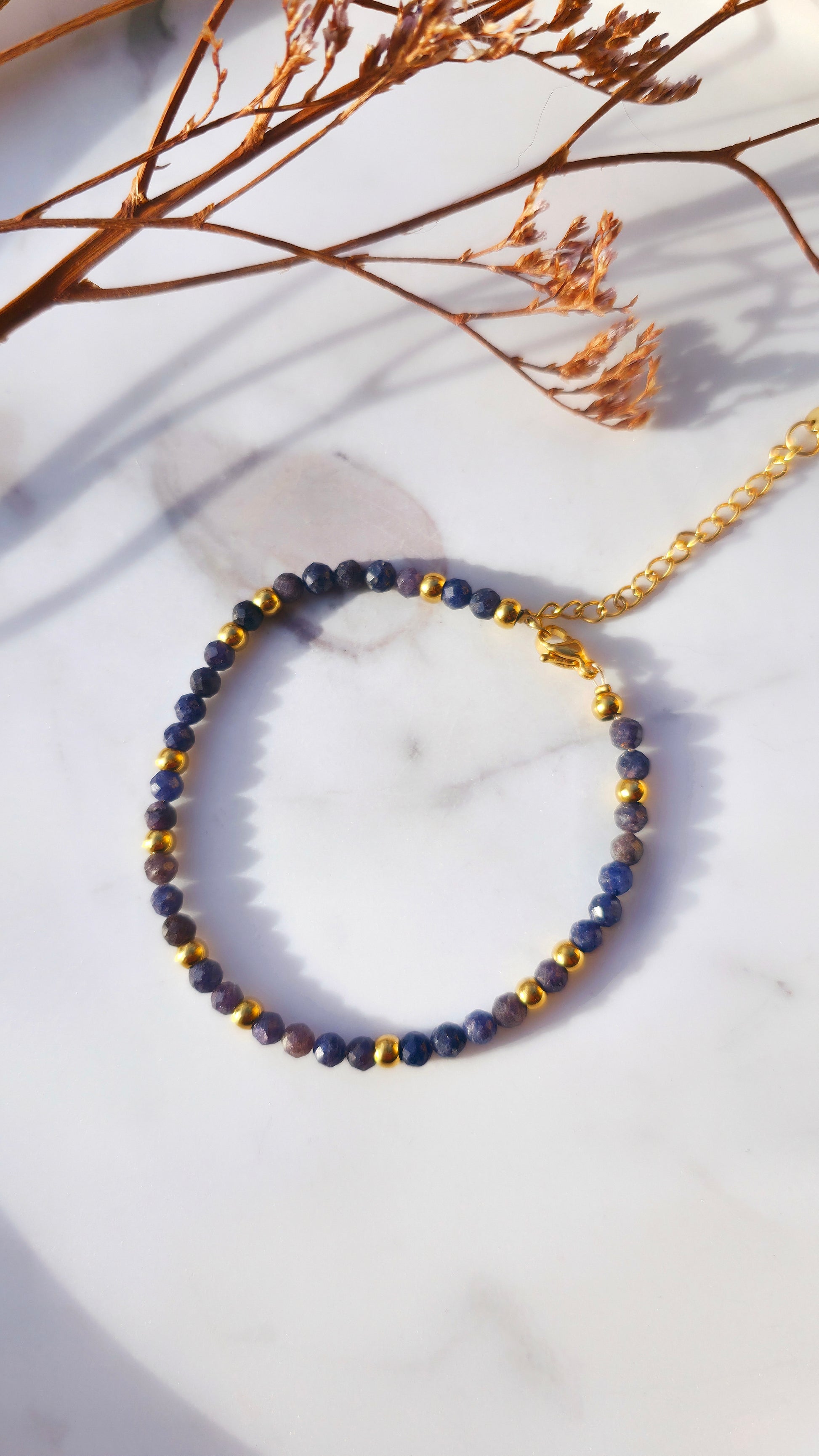 Dieses edle Armband besteht aus echten, 4 mm facettierten Saphirperlen, kombiniert mit hochwertigen, goldenen Edelstahl-Elementen und einer passenden Edelstahl-Verlängerungskette.