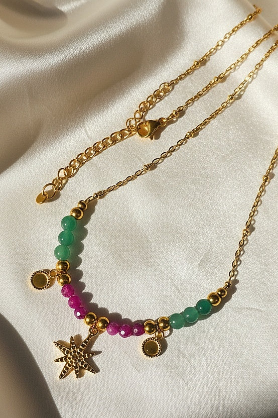 Diese strahlende Edelsteinkette kombiniert Rubin und grünen Aventurin mit hochwertigen, goldenen Edelstahlelementen – veredelt durch einen funkelnden Sternanhänger, der als Symbol für Führung, Hoffnung und innere Stärke gilt.