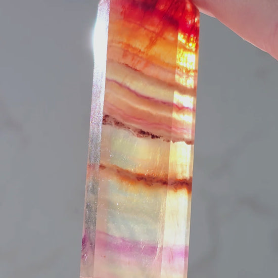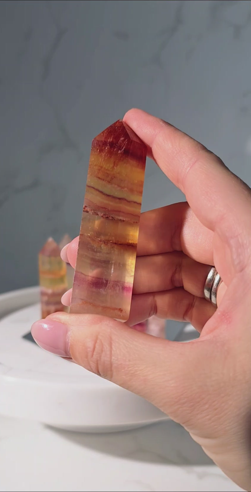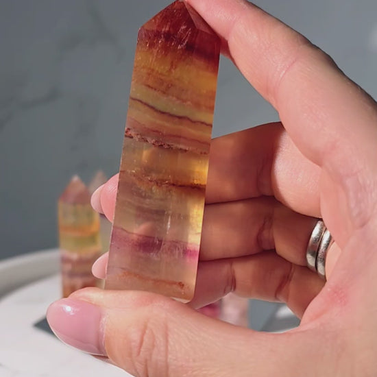 Bitte beachte: Jeder Regenbogenfluorit-Turm mit Feuerquarz ist ein einzigartiges Naturunikat. Farbverläufe, Muster und Einschlüsse variieren und machen dein Stück unverwechselbar.