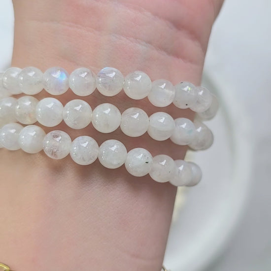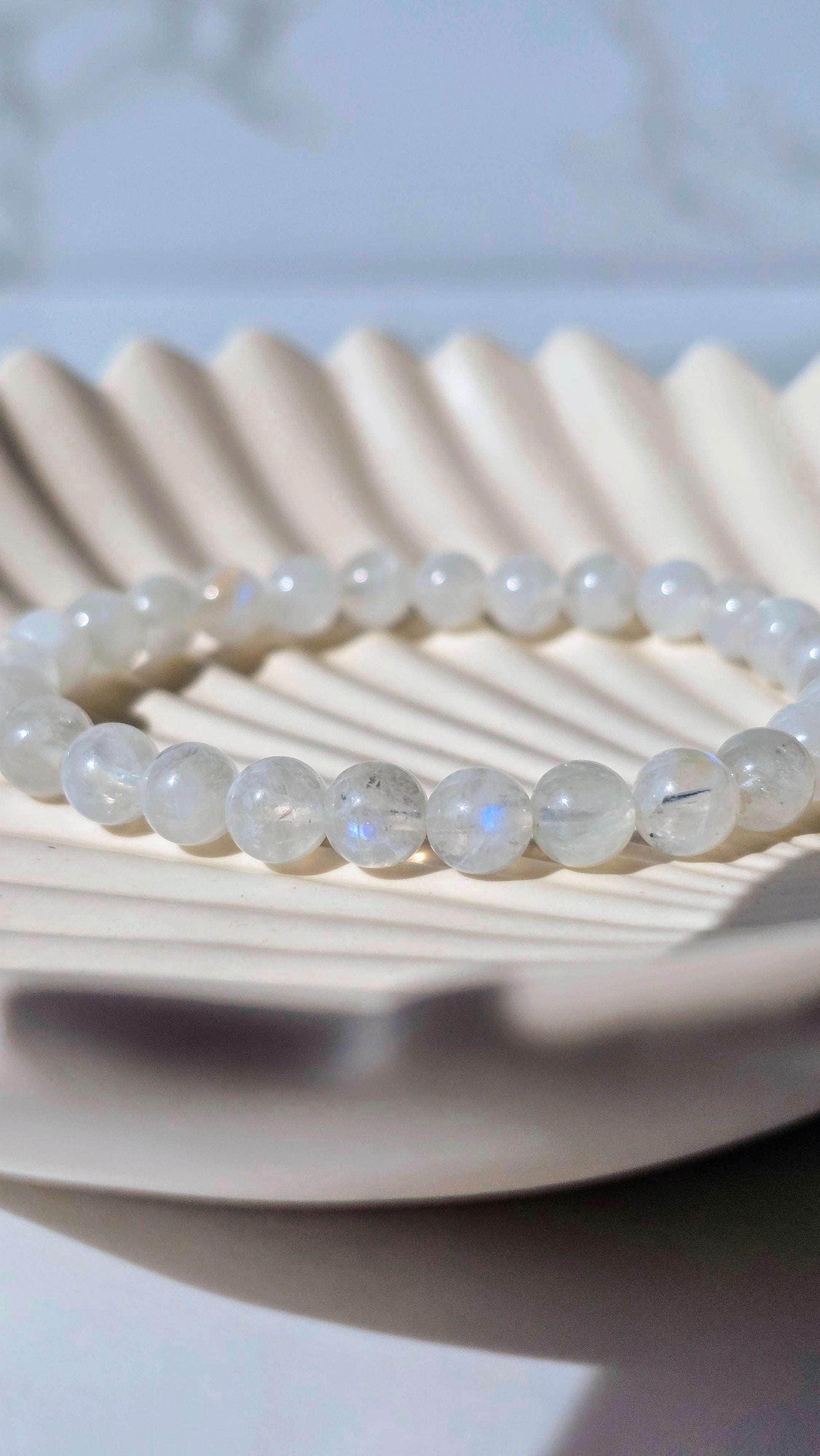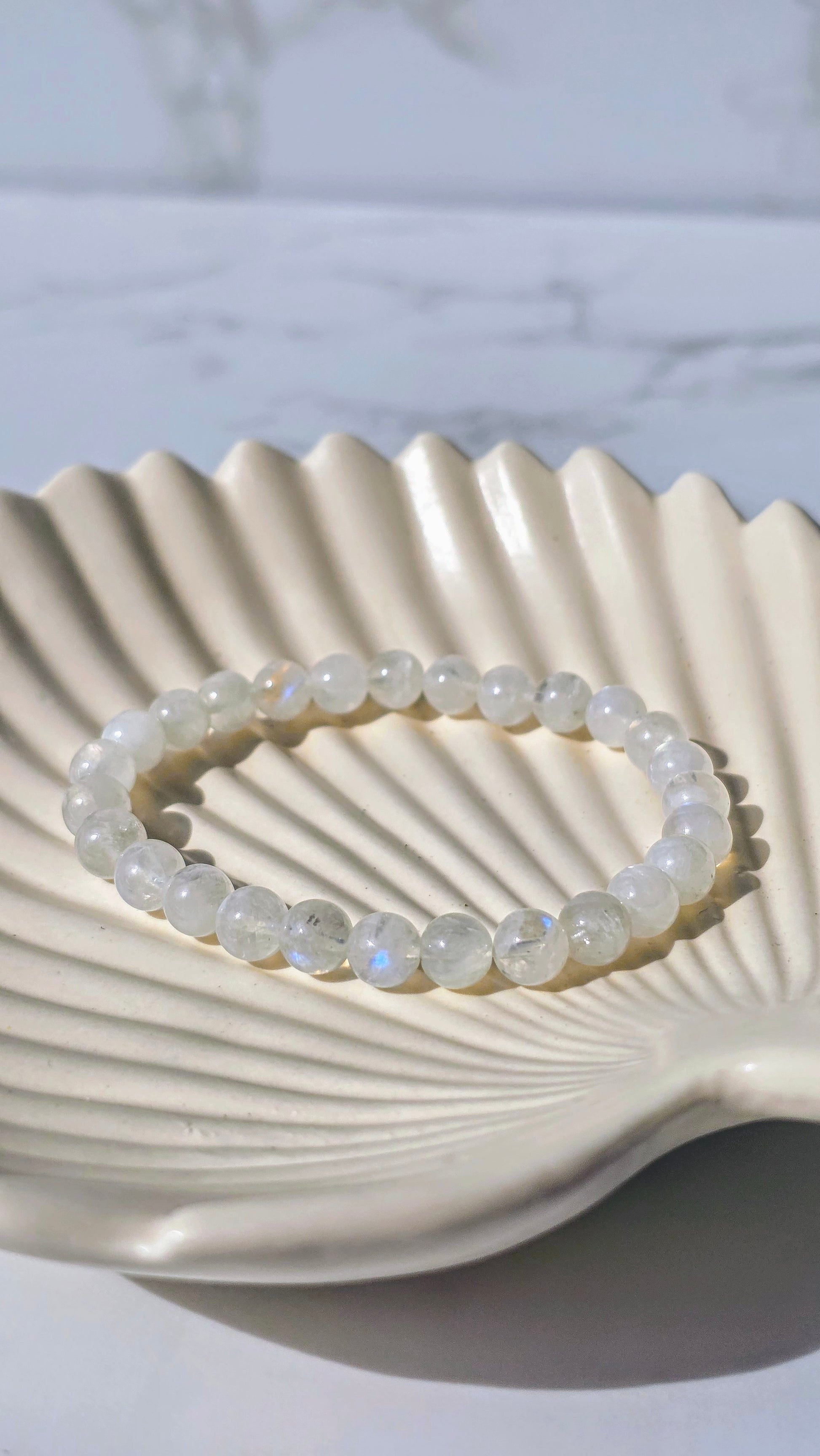 Regenbogen-Mondstein Armband mit Blauem Flash – 7 mm Kugeln