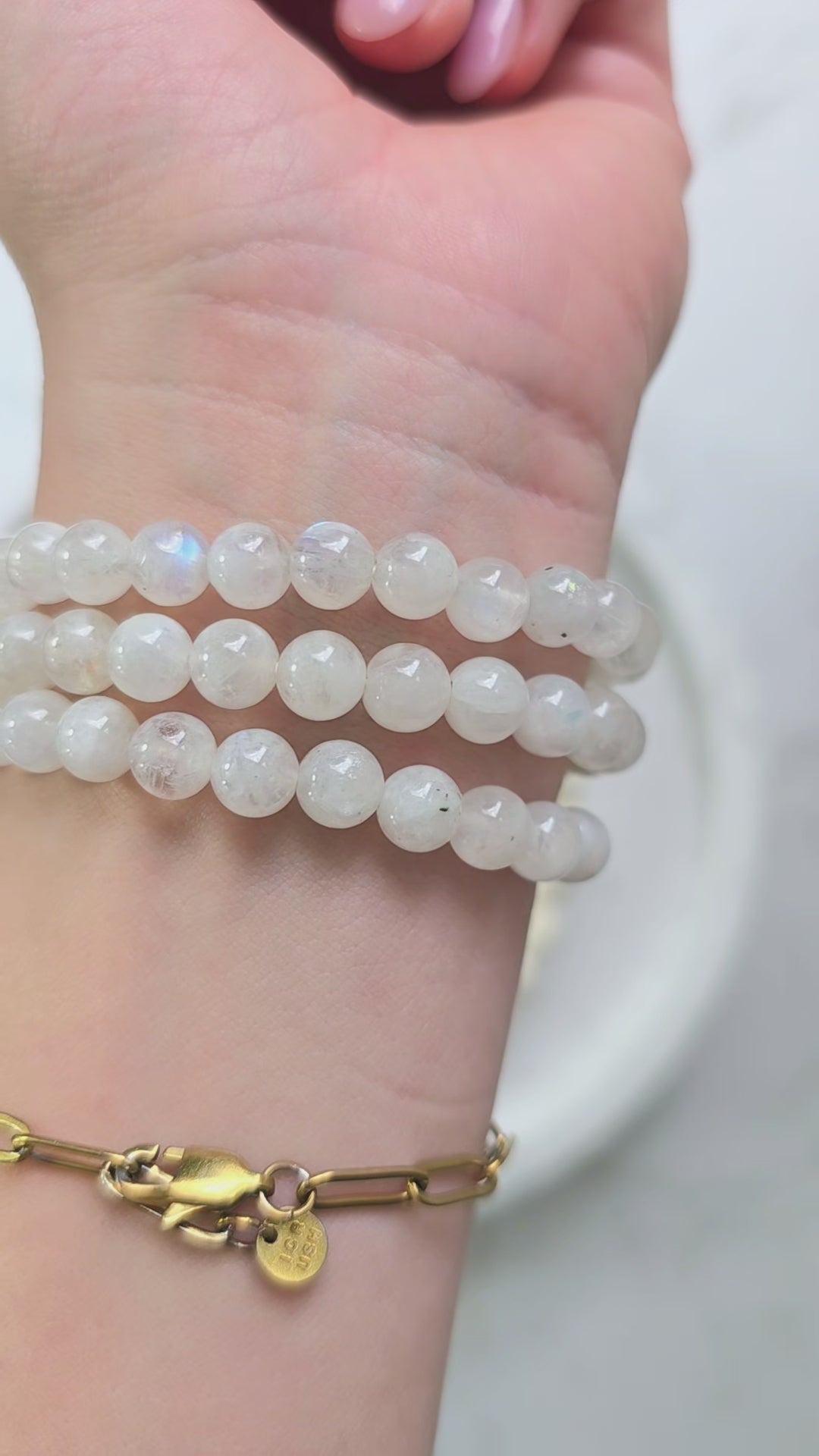 Dieses Regenbogen-Mondstein Armband bezaubert mit feinen 4 mm Kugeln, die je nach Lichteinfall ein geheimnisvolles Farbspiel zeigen – mit einem intensiven blauen Flash als besonderes Highlight. Regenbogen-Mondstein ist eine helle, besonders schimmernde Varietät des weißen Labradorits und verbindet die Magie des Lichtes mit einer sanften, klaren Energie.