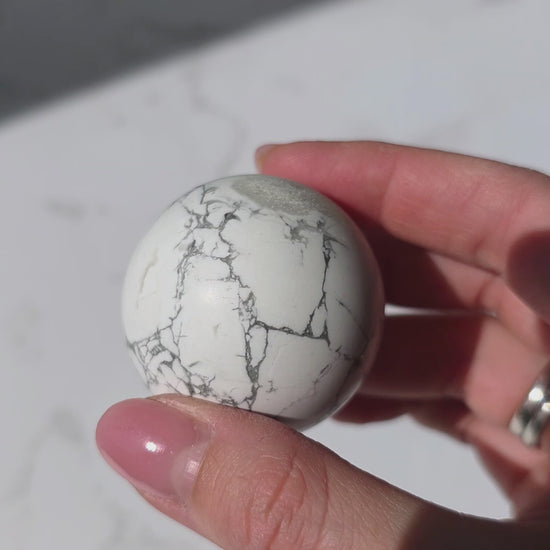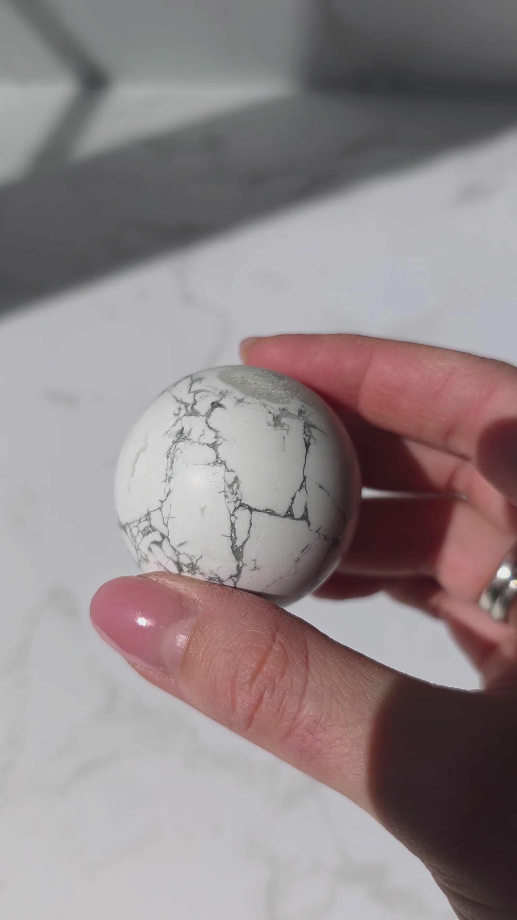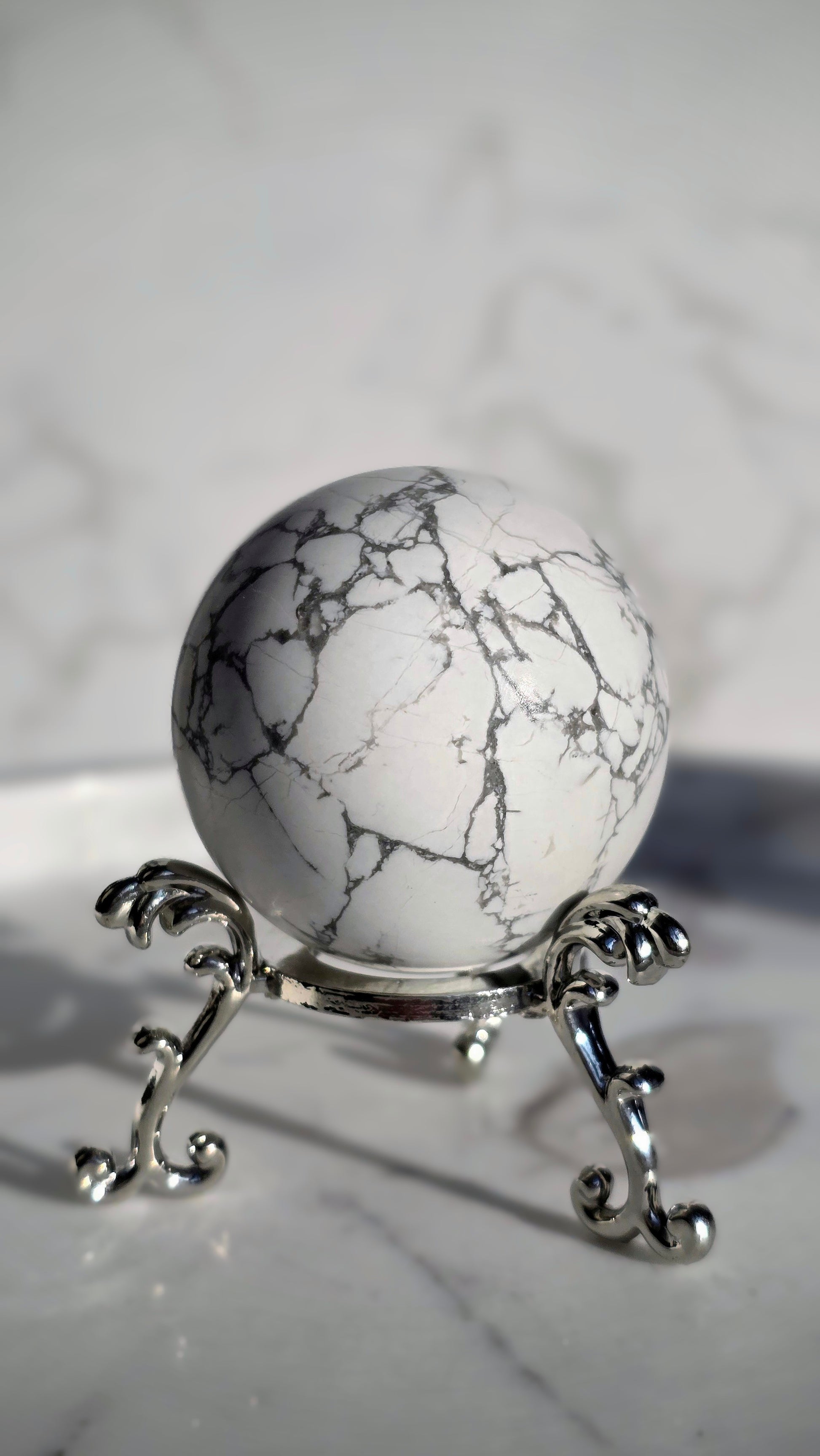 Diese Howlith Kugel besticht durch ihre ruhige Ausstrahlung und die feinen, grau-schwarzen Äderchen, die wie zarte Verästelungen durch das milchige Weiß ziehen. Der kugelige Schliff sorgt dafür, dass sich ihre beruhigende Energie gleichmäßig im Raum verteilt.
