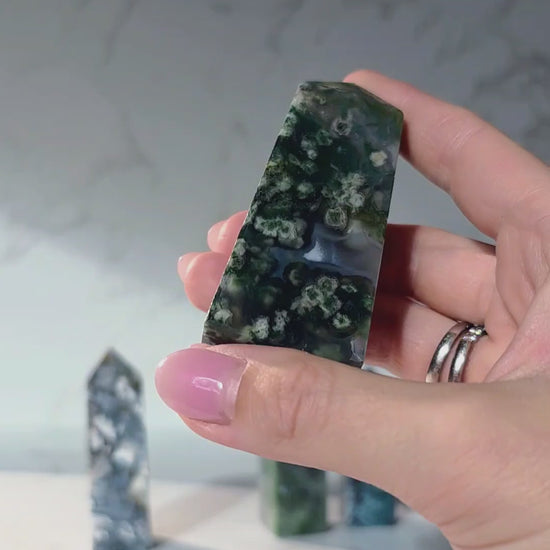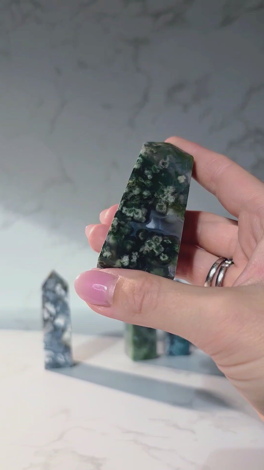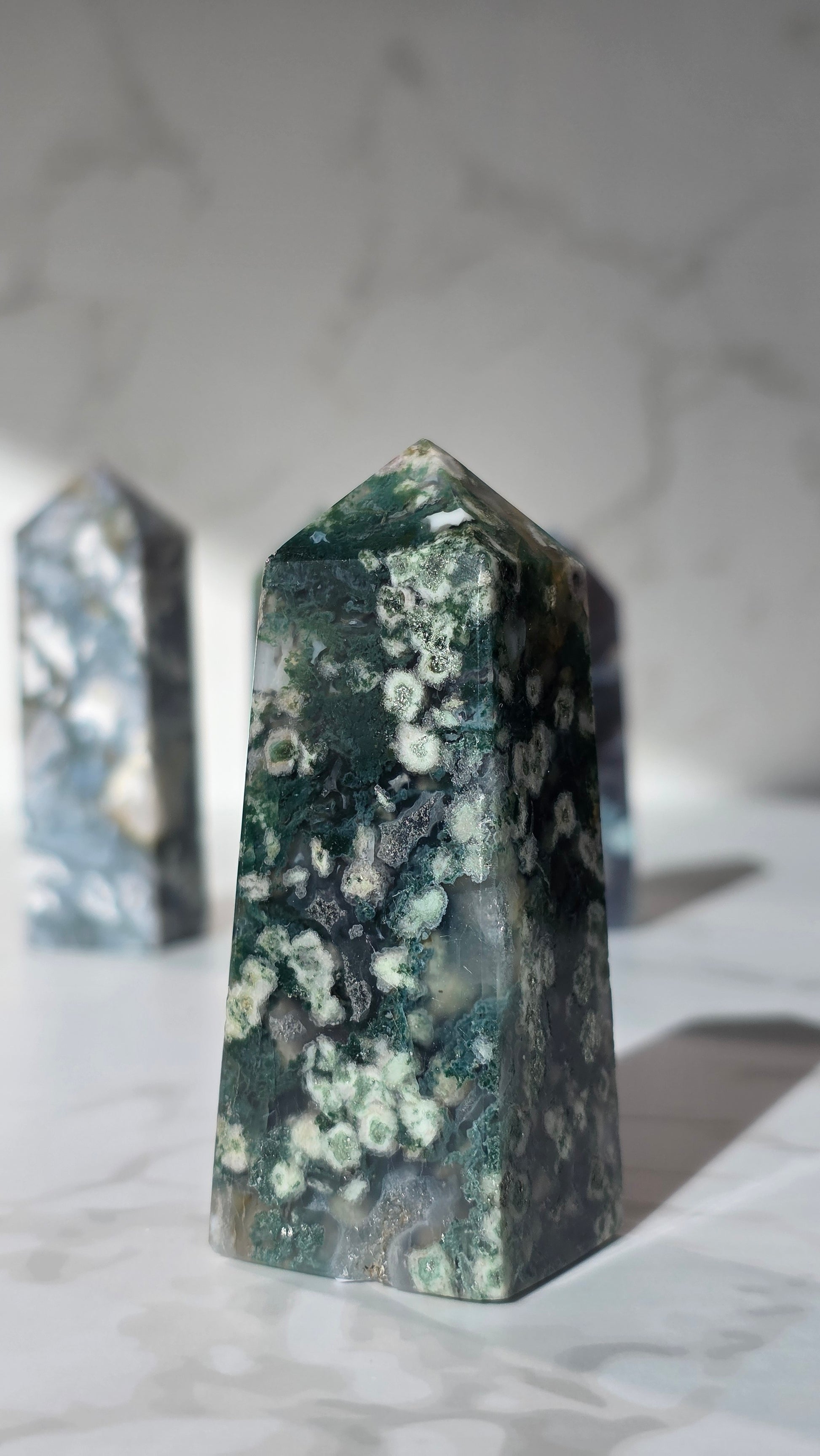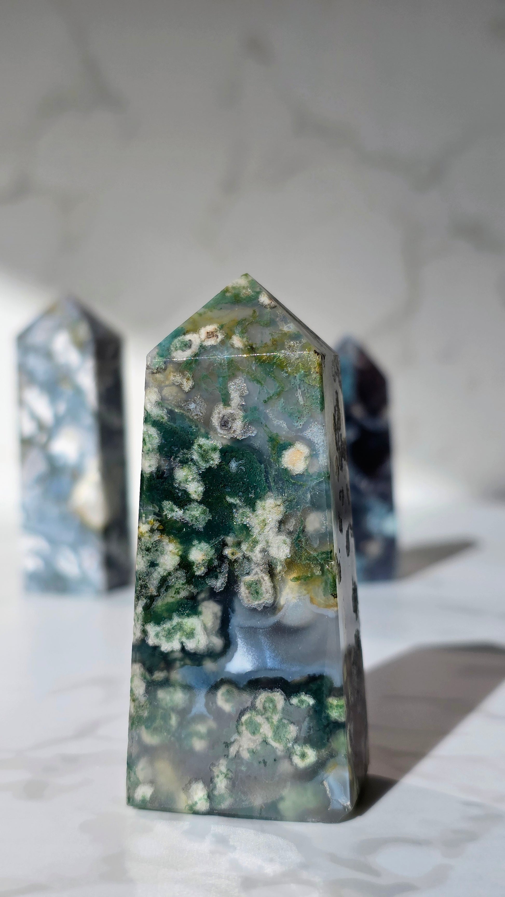 Moosachat gehört zur Familie der Chalcedone und wird wegen seiner faszinierenden Muster geschätzt – entstanden durch eingewachsene grüne Mineraleinschlüsse, meist aus Chlorit oder Eisen. Der Turm-Schliff bringt die Strukturen besonders gut zur Geltung und lässt Licht durchschimmern, als blicke man in eine kleine Welt aus Stein.