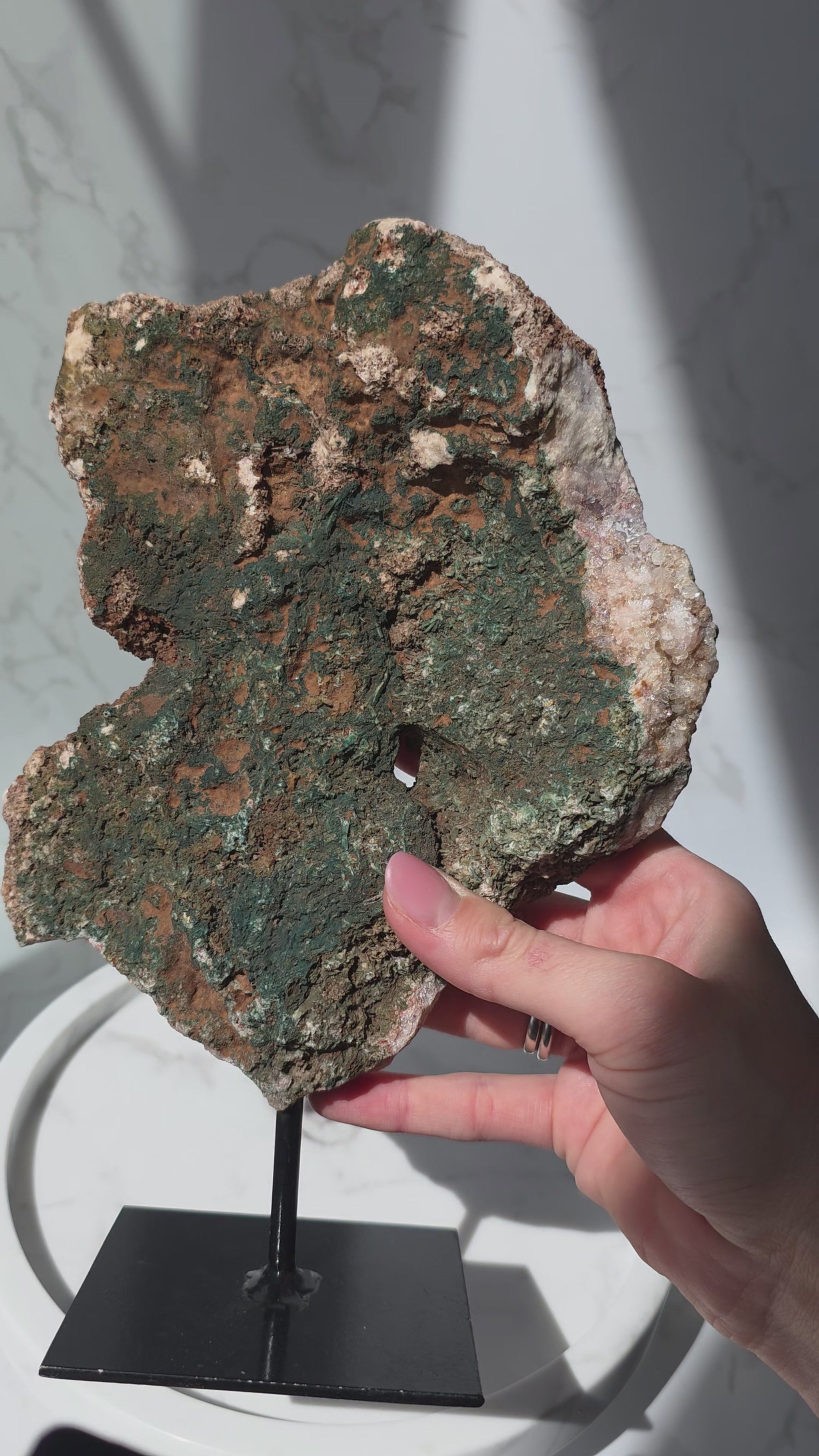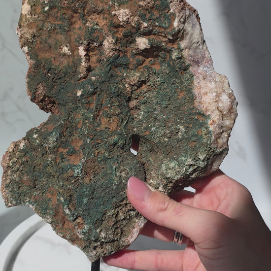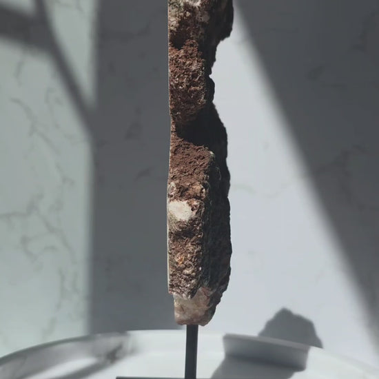 Dieser edle Pink Amethyst Slab auf Ständer ist ein wahrer Blickfang und vereint sanfte Eleganz mit der kraftvollen Energie des Amethysts. Pink Amethyst wurde erstmals 2017 in Patagonien, Argentinien, entdeckt und zählt zu den seltensten Amethyst-Varietäten. Seine charakteristische rosa Farbe entsteht durch Spuren von Hämatit und macht ihn zu einer begehrten Rarität unter Sammlern und Kristall-Liebhabern.