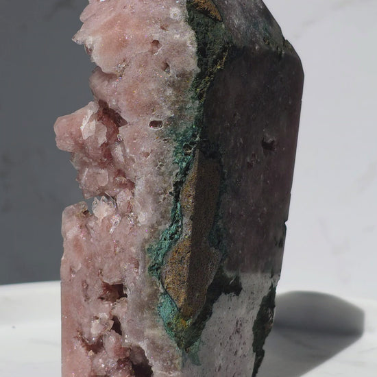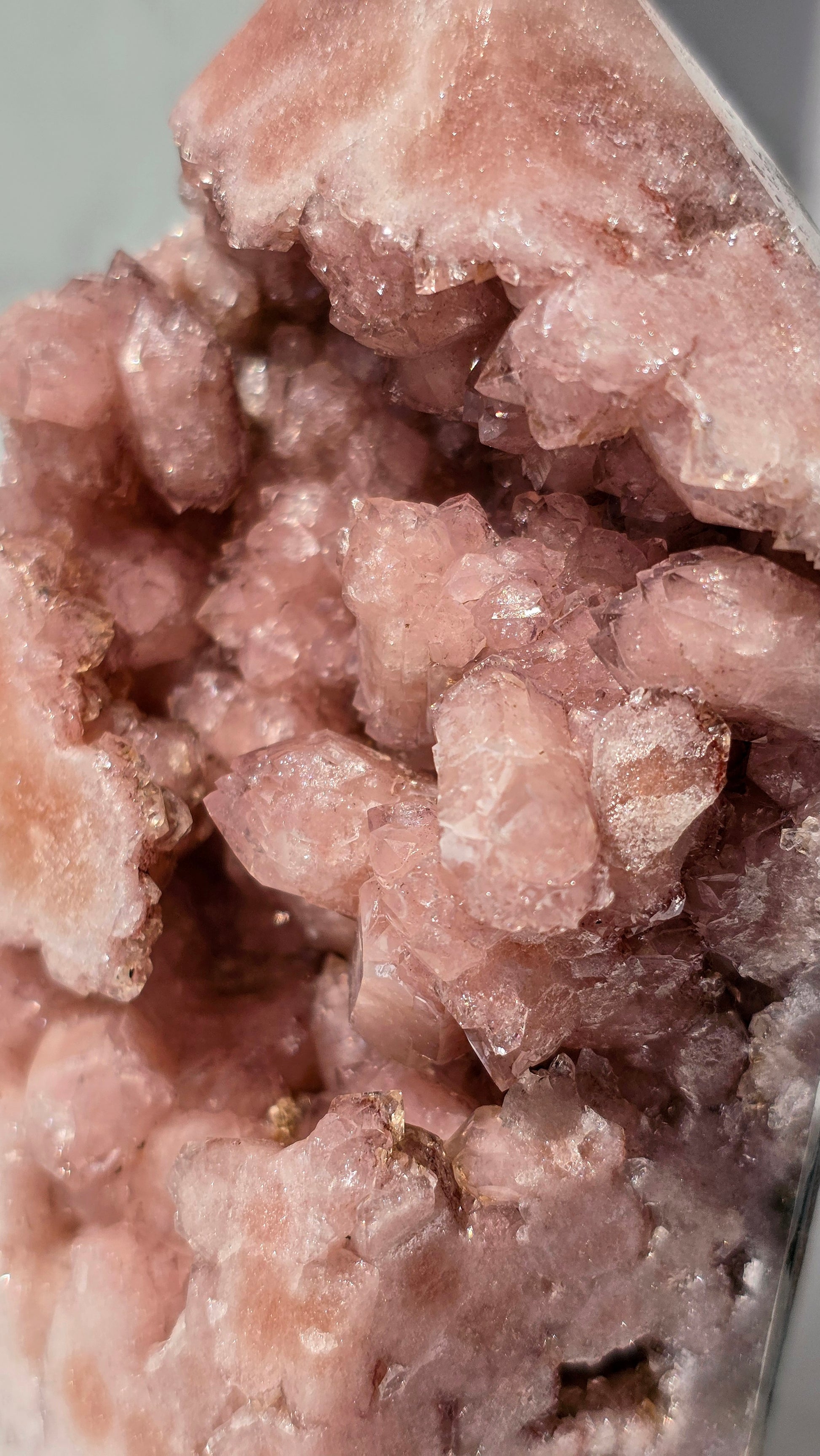 Dieser atemberaubende Pink-Amethyst-Turm vereint die sanfte Energie des Amethysts mit einer einzigartigen rosafarbenen Nuance. Seine Oberfläche ist durchzogen von zahlreichen glitzernden Drusen, die das Licht einfangen und ihn lebendig funkeln lassen. Die außergewöhnliche Farbgebung entsteht durch natürliche Eisenanteile, die diesem Kristall seine besondere, zarte Schönheit verleihen.