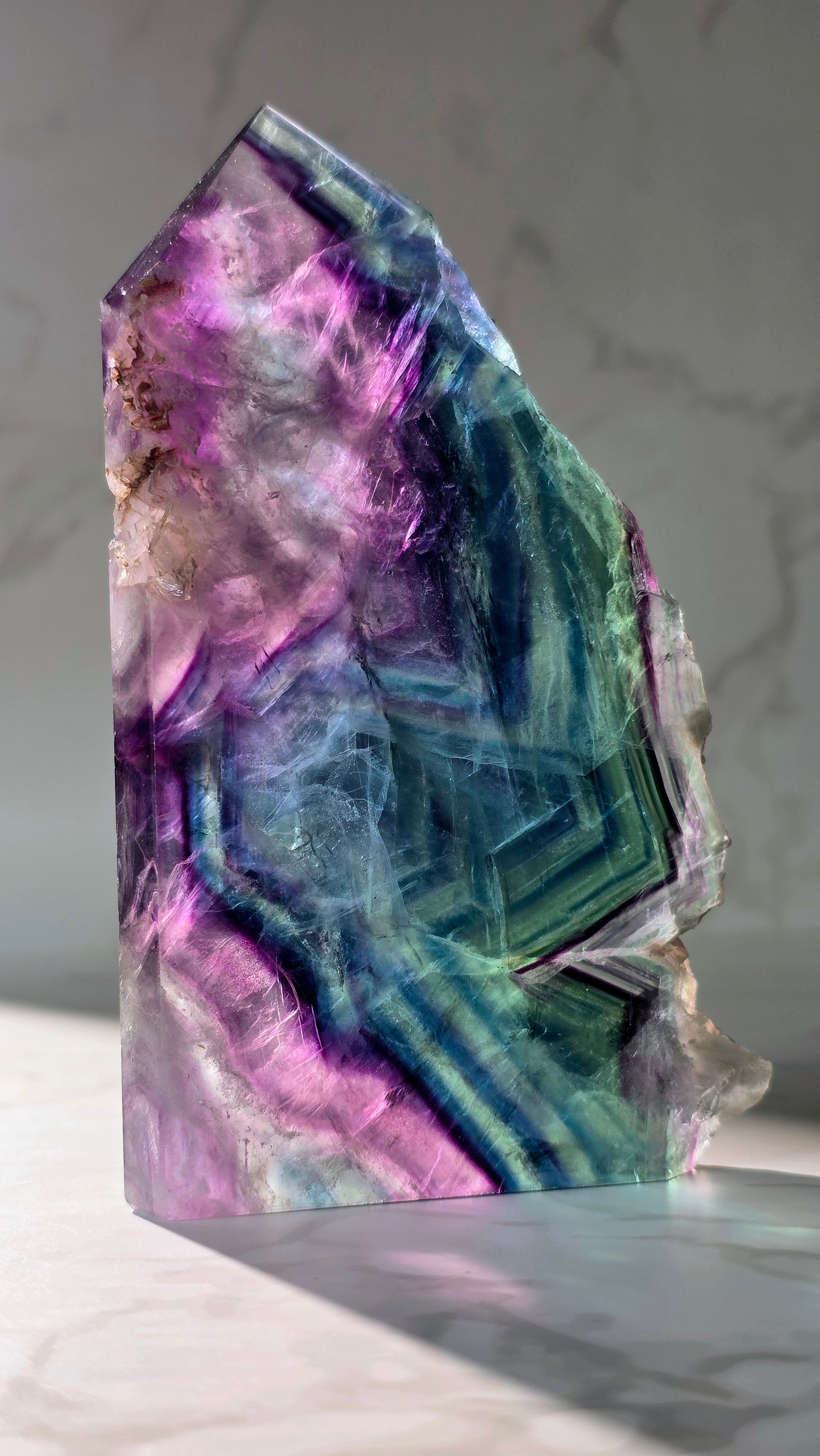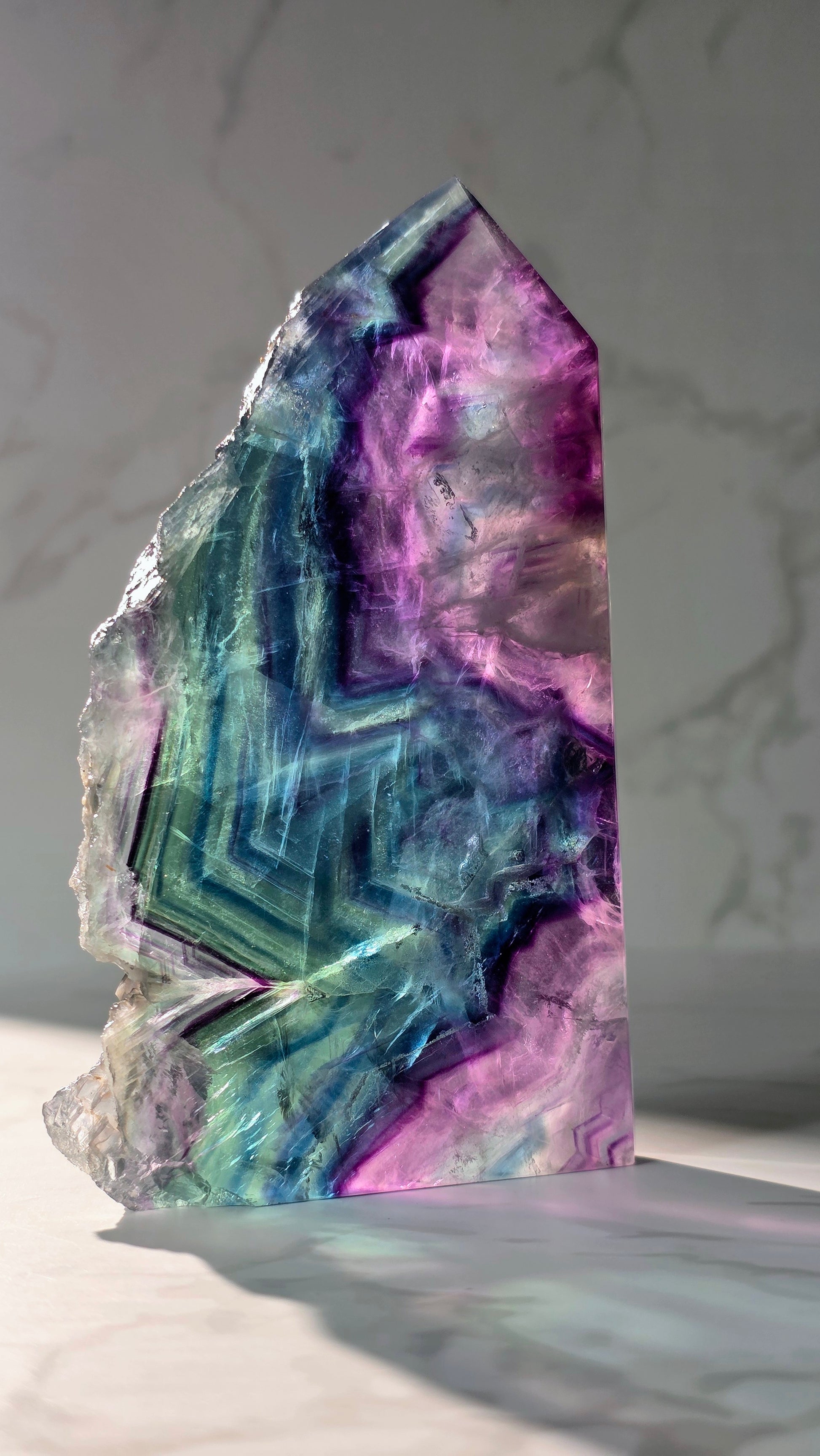 Dieser Regenbogenfluorit Turm ist ein echtes Meisterwerk der Natur – mit einem leuchtenden Farbverlauf von kühlem Blau über zartes Türkis bis hin zu Violett und Rosa. Eine Seite ist kunstvoll poliert und bringt die strahlenden Farben perfekt zur Geltung, während die andere Seite roh und ursprünglich bleibt – als sichtbares Zeichen der natürlichen Kraft des Steins.