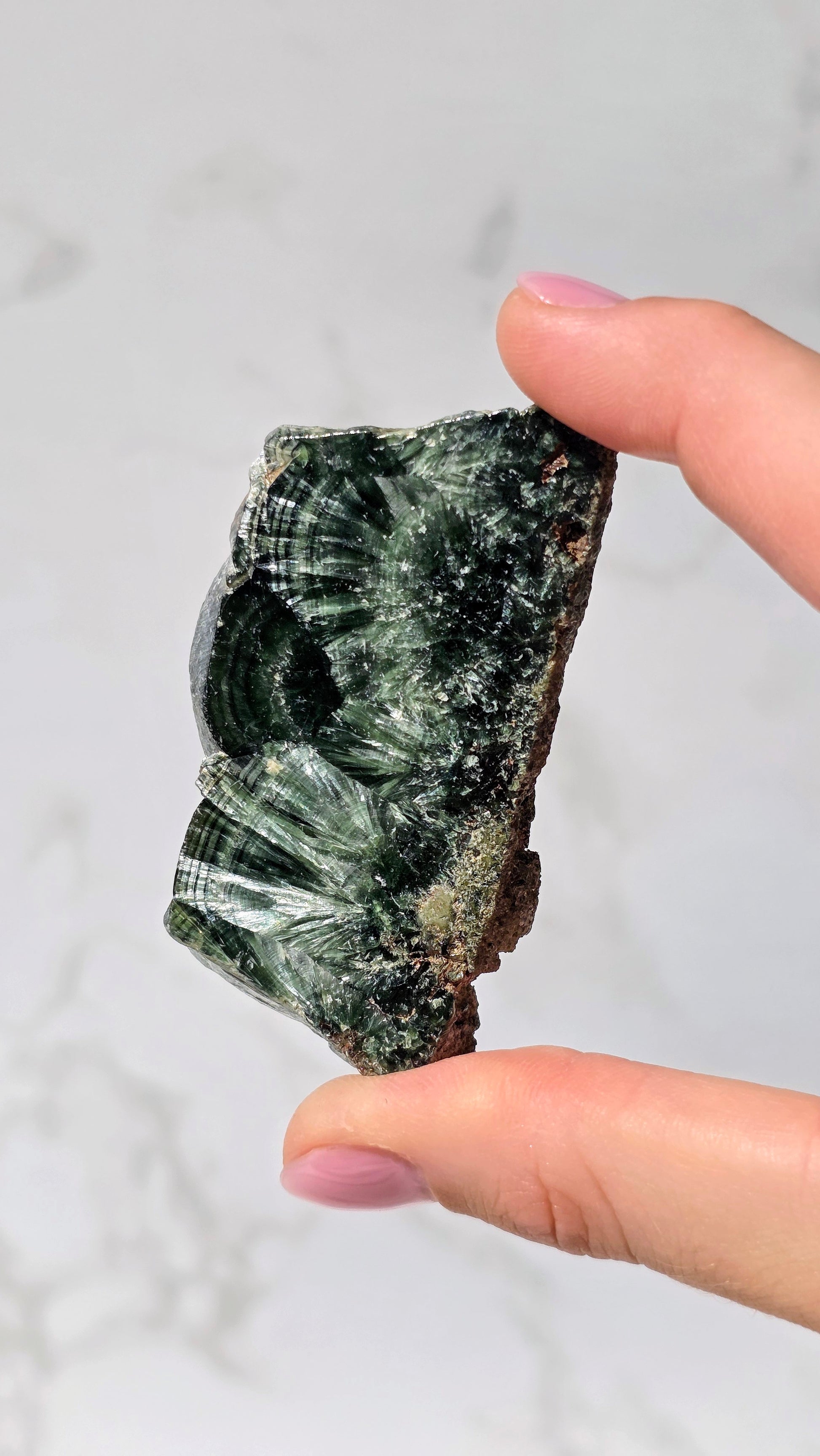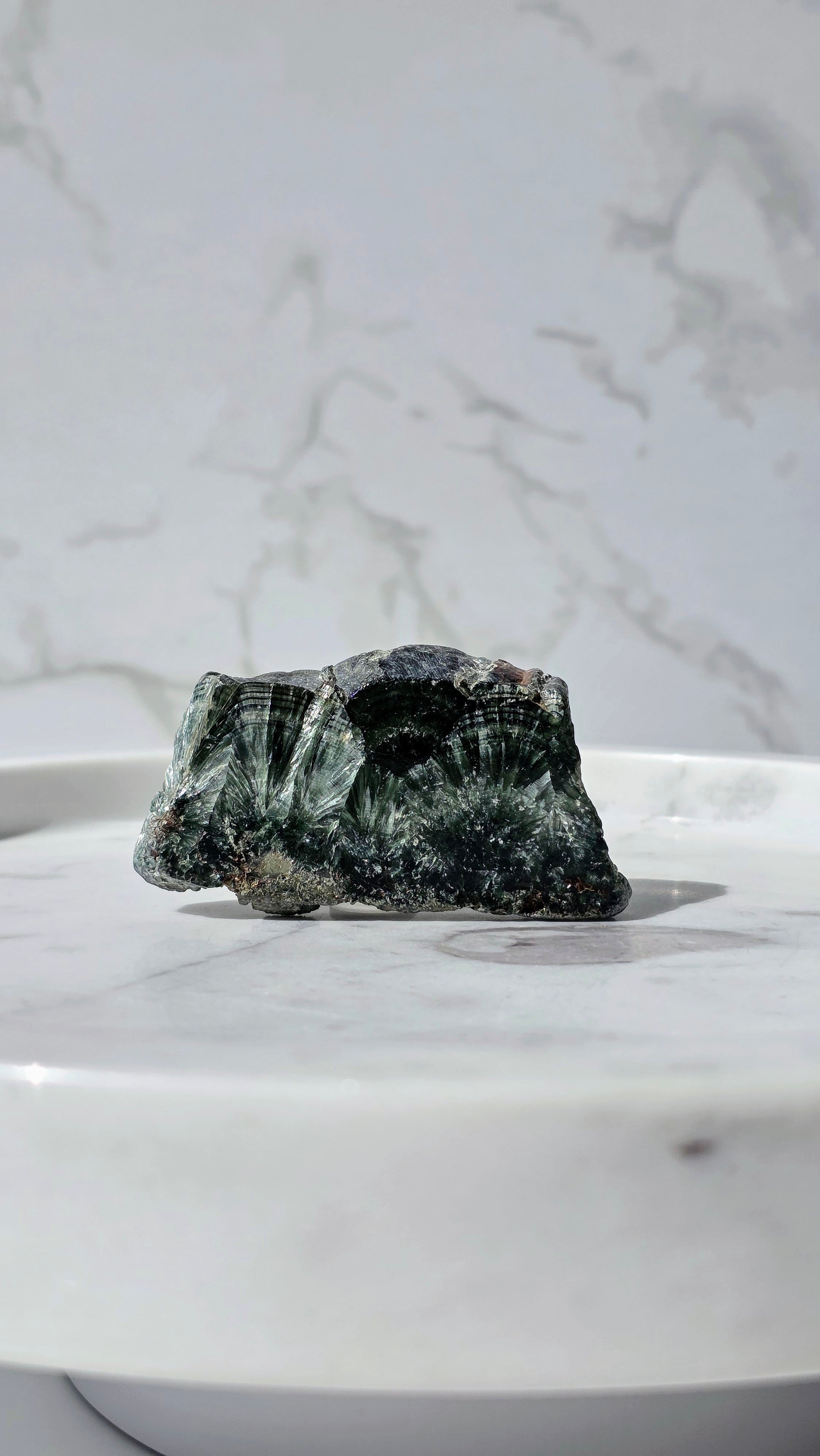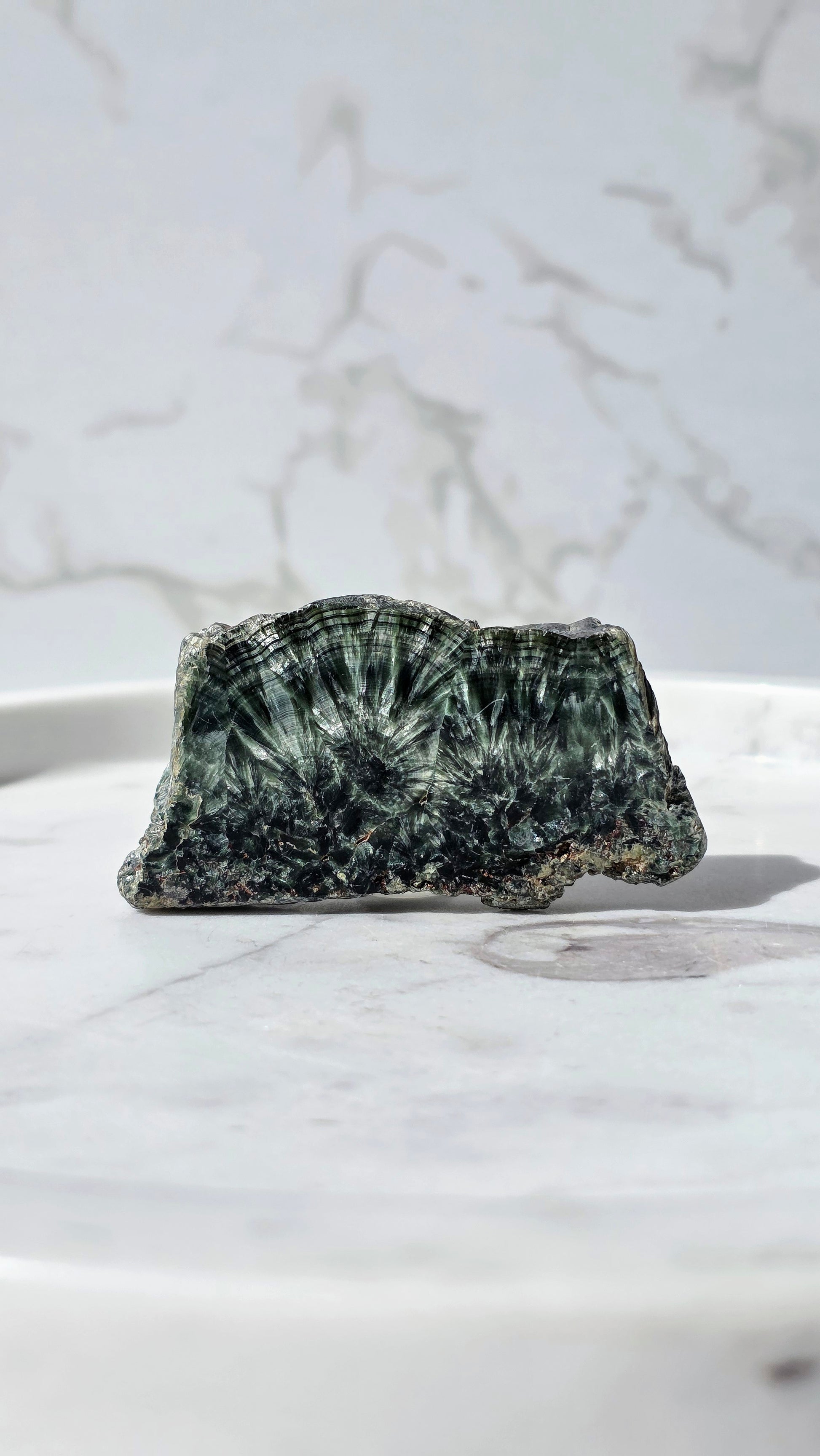 Diese Seraphinit Scheibe ist ein echter Schatz aus den Tiefen Sibiriens – selten, faszinierend und voller Energie. Ihr markanter silbriger Schimmer durchzieht das tiefdunkle Grün wie zarte Engelsflügel und verleiht dem Stein seine charakteristische, fast mystische Ausstrahlung. Kein anderer Stein zeigt eine derart „federartige“ Struktur – ein Naturphänomen, das sofort in den Bann zieht.