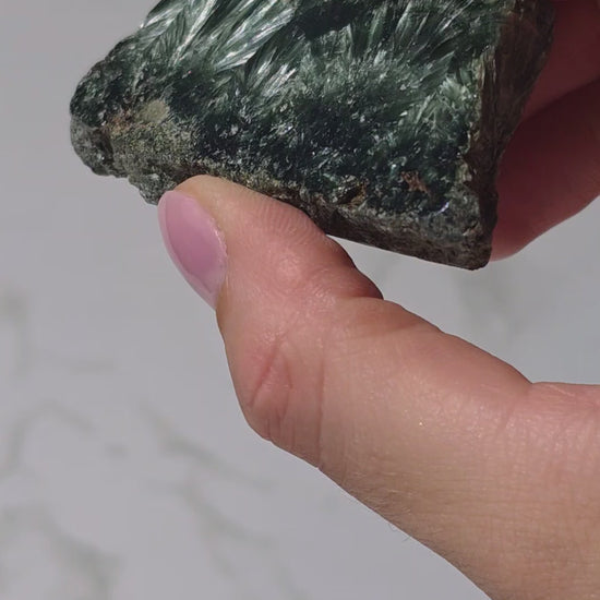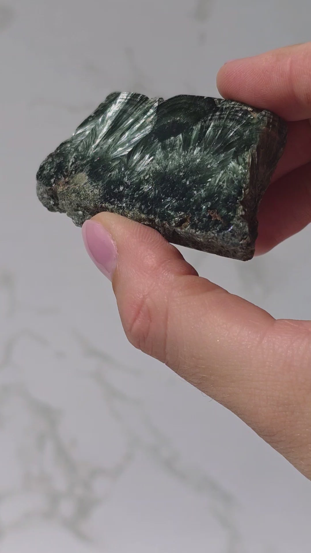 Seraphinit ist ein extrem seltener Edelstein, der ausschließlich in einem einzigen Gebiet in Ostsibirien (Region Irkutsk) abgebaut wird – genauer gesagt, aus einer Lagerstätte nahe dem Baikalsee. Er gehört zur Chlorit-Gruppe, ist aber durch seine einzigartigen, silbernen Glimmer-Einschlüsse optisch und energetisch herausragend. Diese Einschlüsse sorgen für den unverkennbaren Schimmer, der an gefiederte Engelsflügel erinnert – daher auch der Name „Seraphinit“, benannt nach den höchsten Engeln der himmlischen Ordnung, den Seraphim.