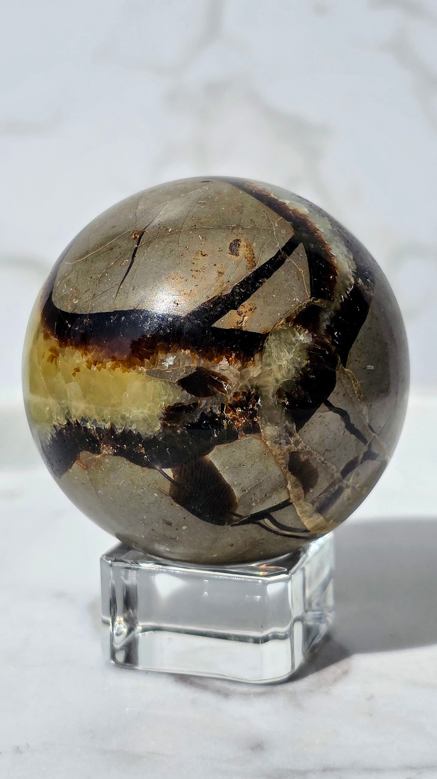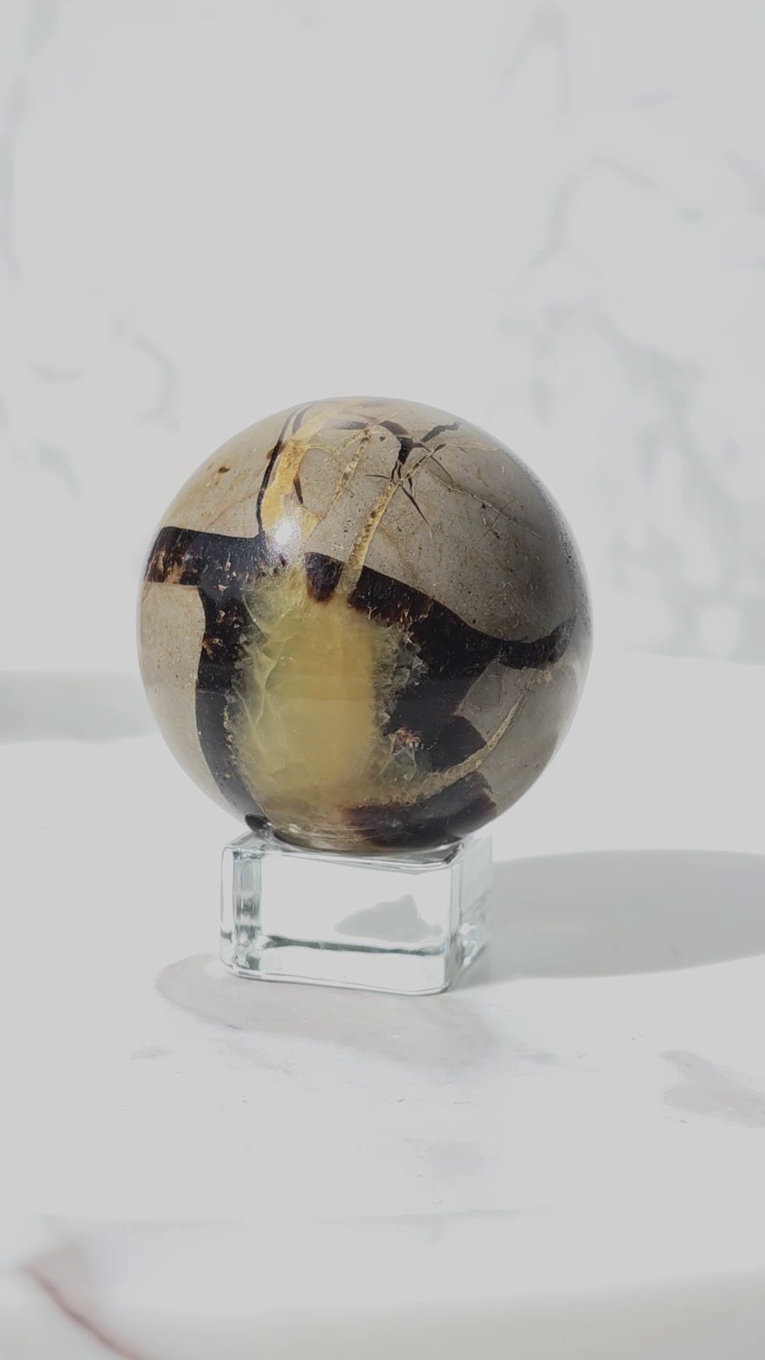 ✔ Besonderheit: Polierte Septarie Kugel mit faszinierender Zeichnung aus Kalk, Aragonit und Tonmineralien.