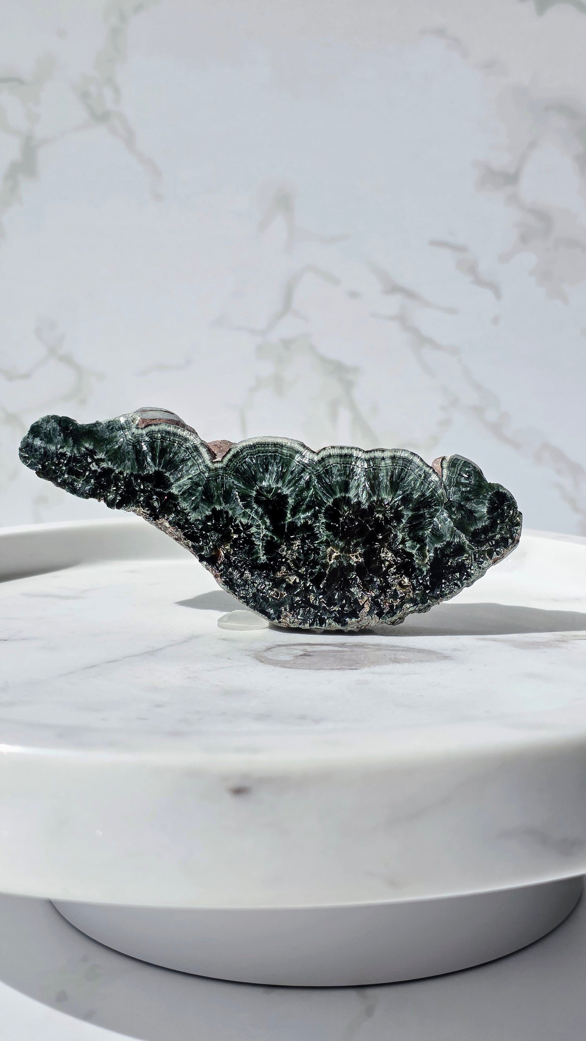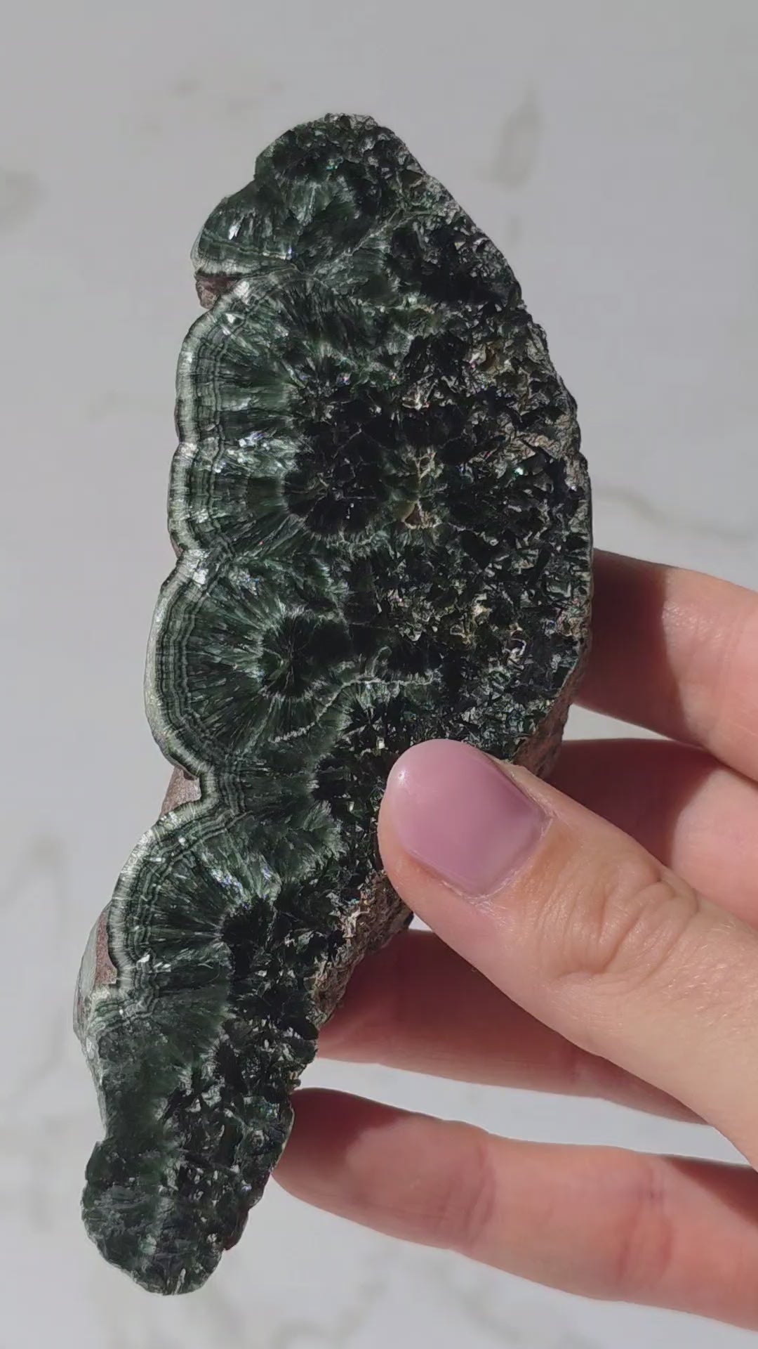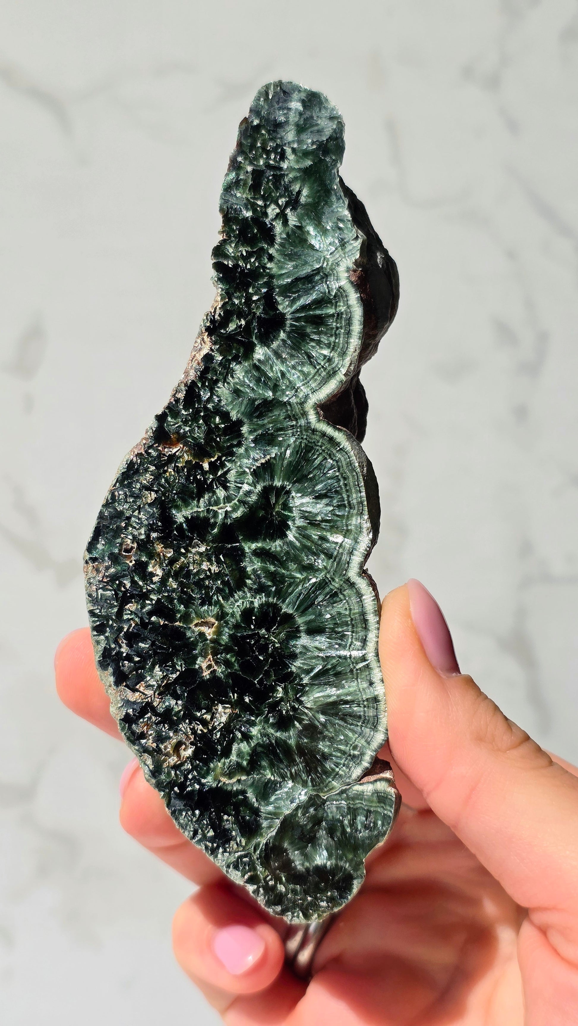 Diese Seraphinit Scheibe ist ein echter Schatz aus den Tiefen Sibiriens – selten, faszinierend und voller Energie. Ihr markanter silbriger Schimmer durchzieht das tiefdunkle Grün wie zarte Engelsflügel und verleiht dem Stein seine charakteristische, fast mystische Ausstrahlung. Kein anderer Stein zeigt eine derart „federartige“ Struktur – ein Naturphänomen, das sofort in den Bann zieht.