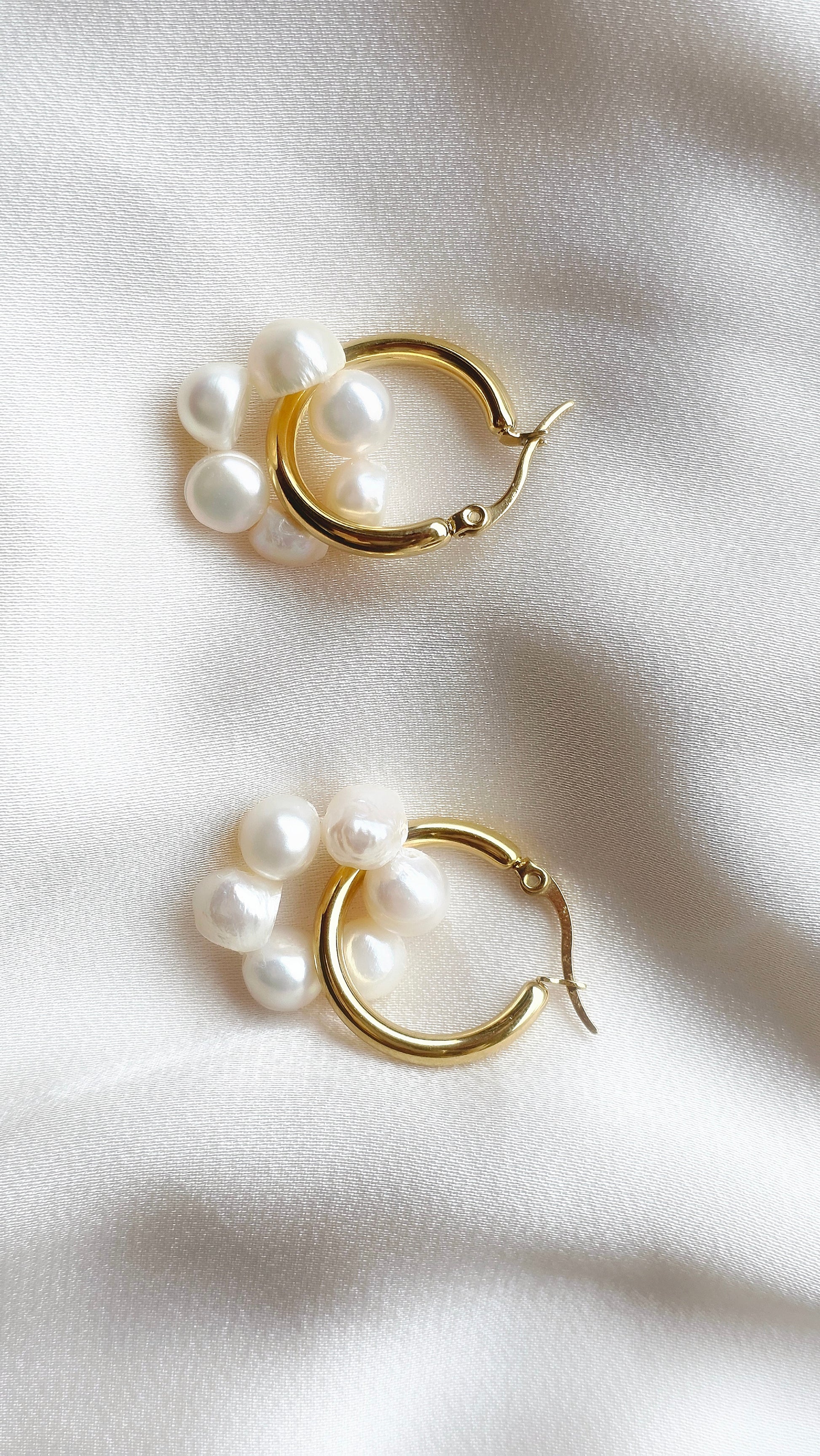 Die goldfarbenen Edelstahl-Kreolen tragen einen feinen Ring aus perlmuttschimmernden Süßwasserperlen in sanftem Cremeton. Rund, leicht flach und natürlich geformt – jede Perle ist ein Unikat. Die Kombination aus warmem Goldton und weichem Perlenglanz wirkt feminin, zeitlos und unaufgeregt elegant.