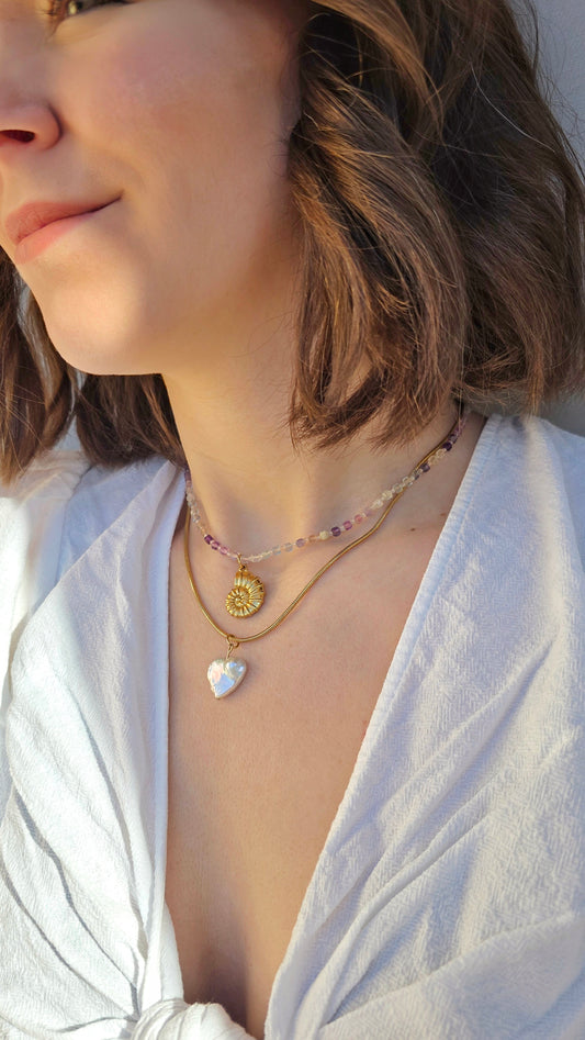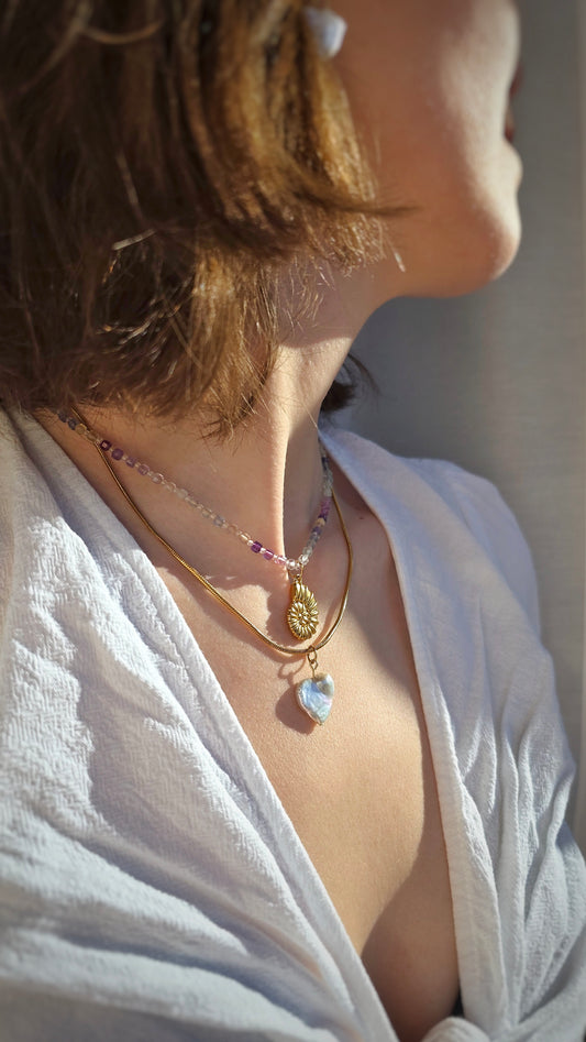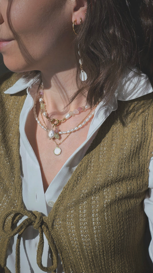 Echte Natursteine und Süßwasserperlen treffen auf 18K vergoldeten Edelstahl – liebevoll handgefertigt, bewusst gestaltet und in limitierter Stückzahl gefertigt.